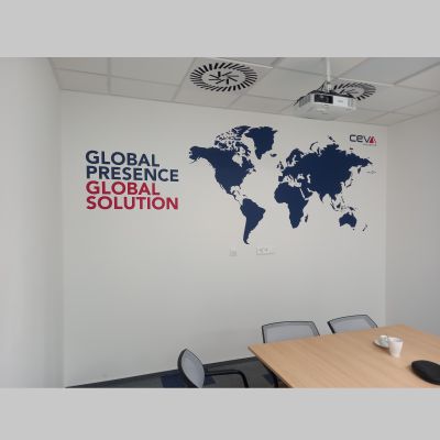 Wallpaper used in the office in Ołtarzew Poland World map cut from plotter film in red and navy colours, size 300x150cm Graphics are prepared for a specific size, type of wallpaper matched to the substrate. We can create any design to meet your needs. Please, contact your Administrator for further details.